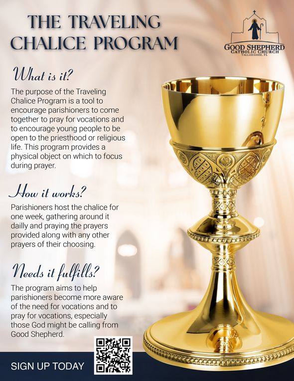 We are excited to relaunch The Traveling Chalice Program at Good Shepherd. Parishioners are encouraged to host the chalice for one week in their home. The program aims to help parishioners become more aware of the need for vocations and to pray for vocations, especially those God might be calling from our Parish family. Please sign up to host by visiting: https://bit.ly/3PeGuOh